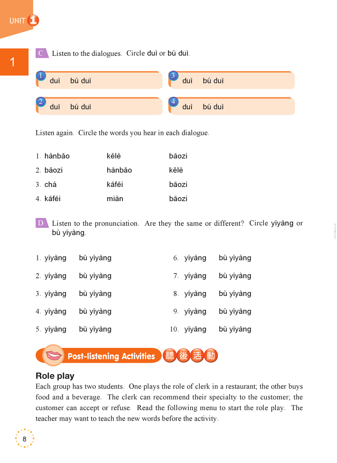 本書依據《遠東生活華語》第一冊每課語言任務,重新規劃設計數字、買賣、付錢、約時間、問方位、找方向、租屋、自我介紹、寄信,以及在餐廳用餐等針對二語學習者台灣日常生活的十項實用主題。教材透過大量的、任務導向為主且有趣的泛聽、精聽練習及創造性的口說練習活動來體現溝通式教學精神。在學習者具備使用基礎中文能力條件下,進一步強化用中文達成日常語言任務的目標,對中文學習者的溝通表達能力起更積極正面的作用。