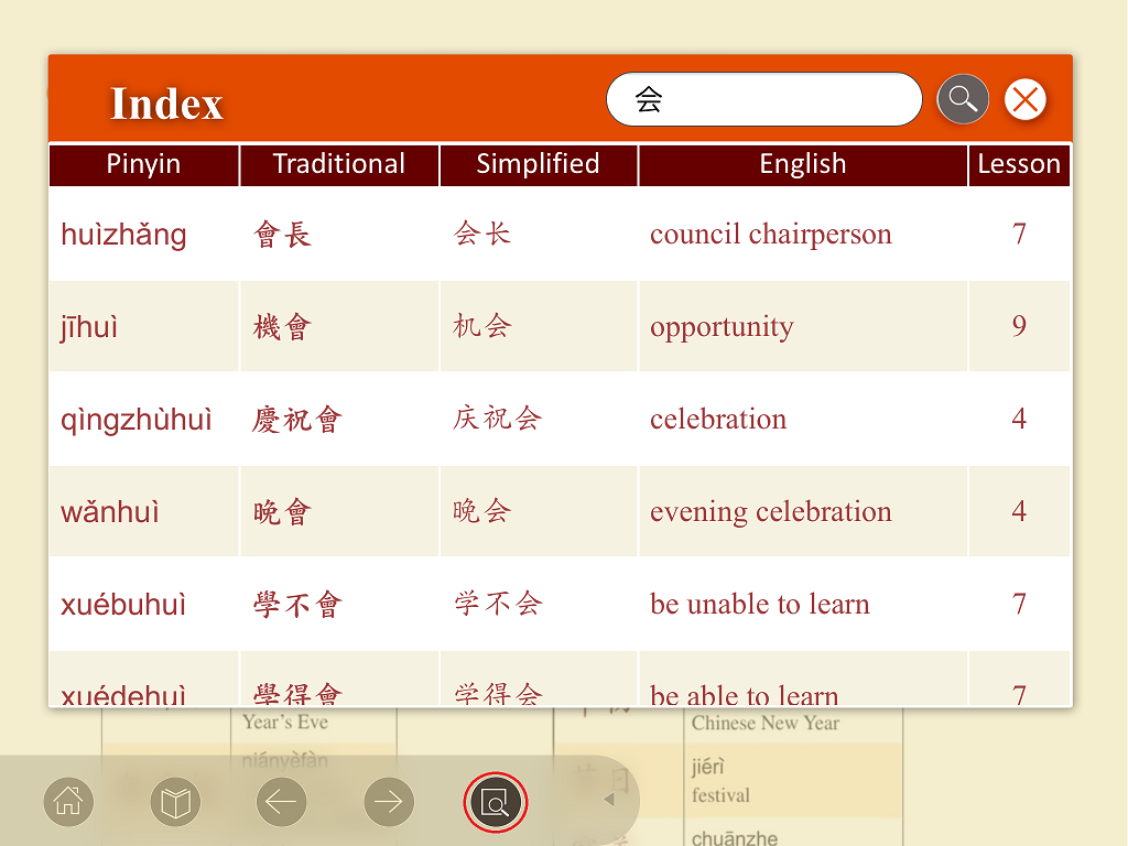 You can type in English, pinyin or Chinese to search for all expressions in the book, and find the lessons they are used in.