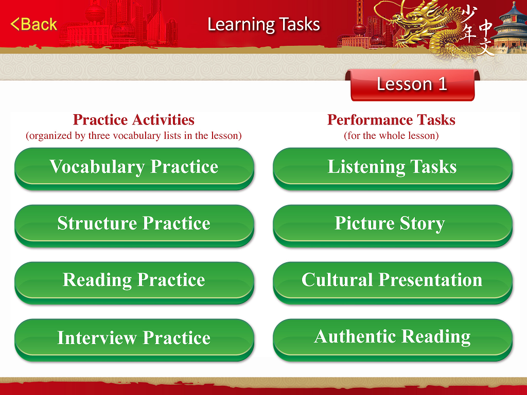There are eight learning tasks in each lesson.