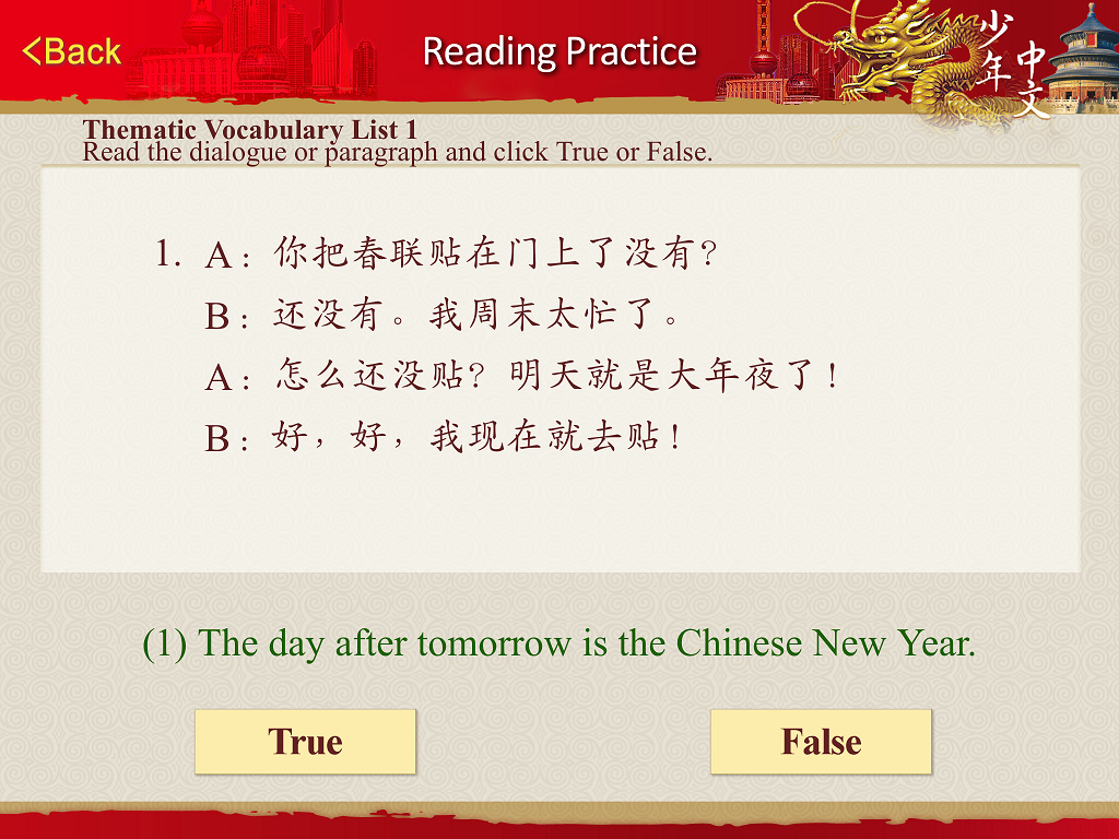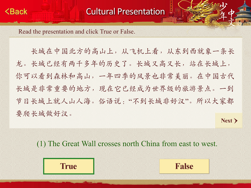Read the paragraph about Chinese culture topic and decide whether the statement in green is true or false, then click the button.